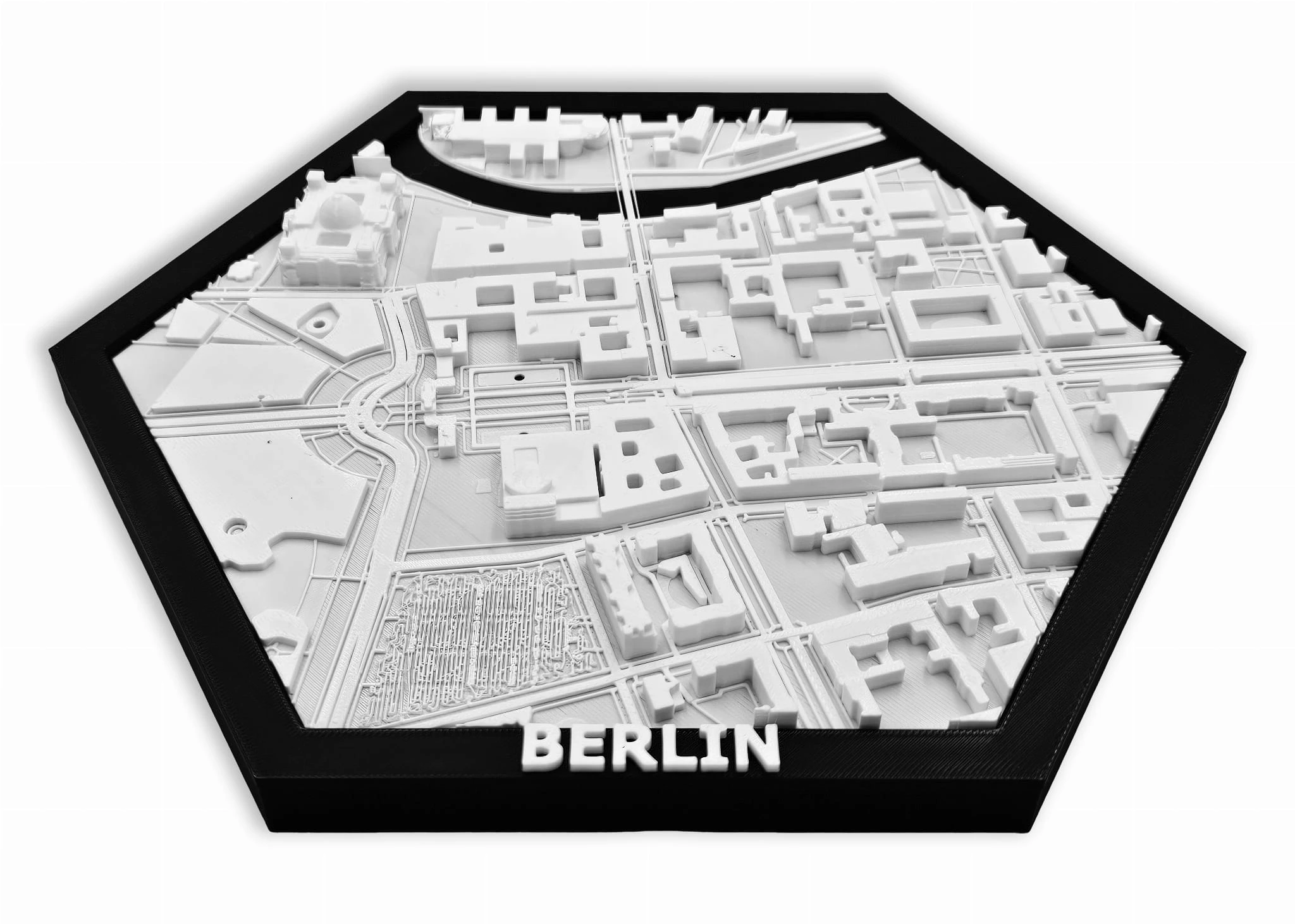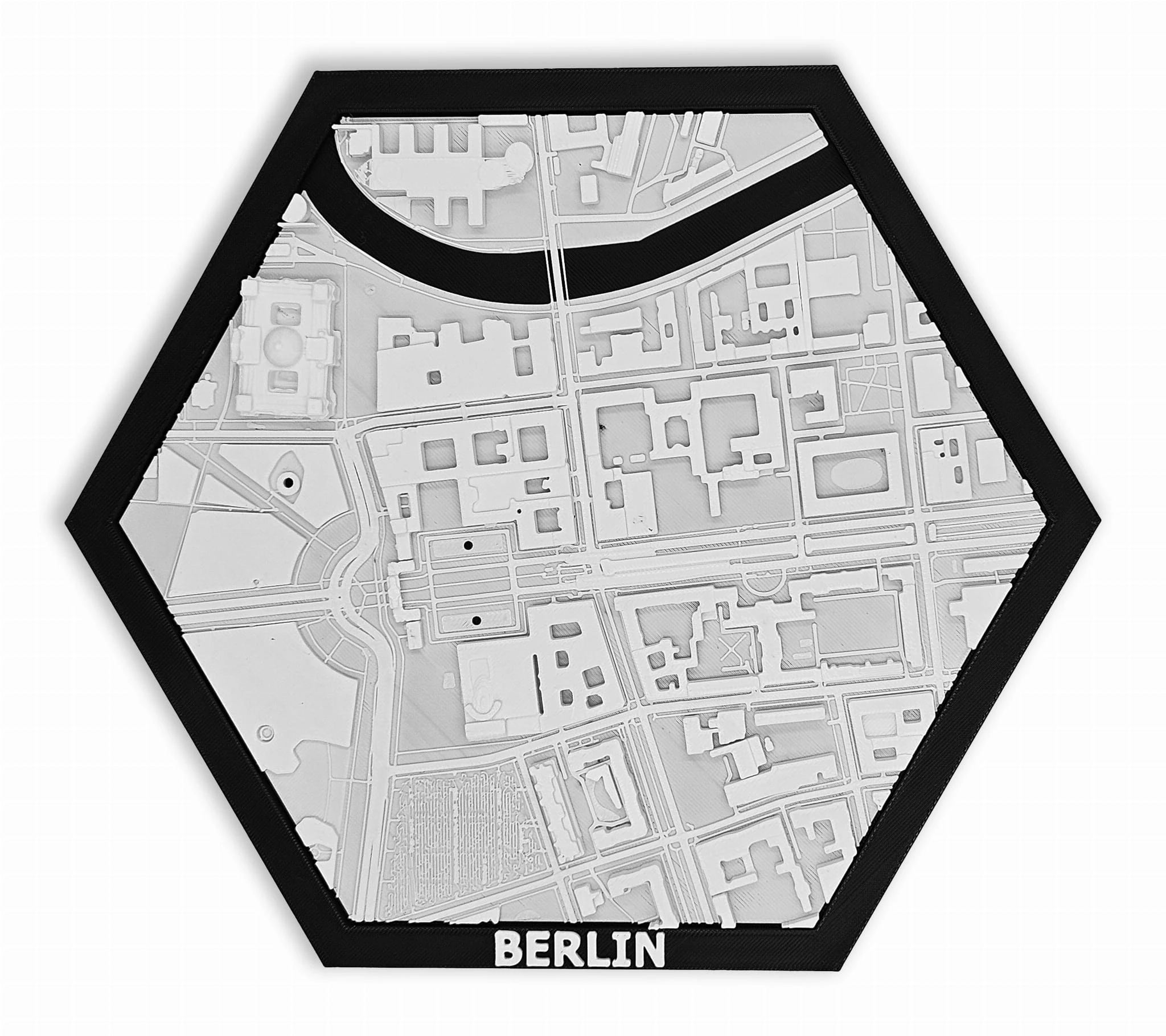 Obraz prezentuje trójwymiarowy plan Berlina w czarnej ramie z możliwością powieszenia.