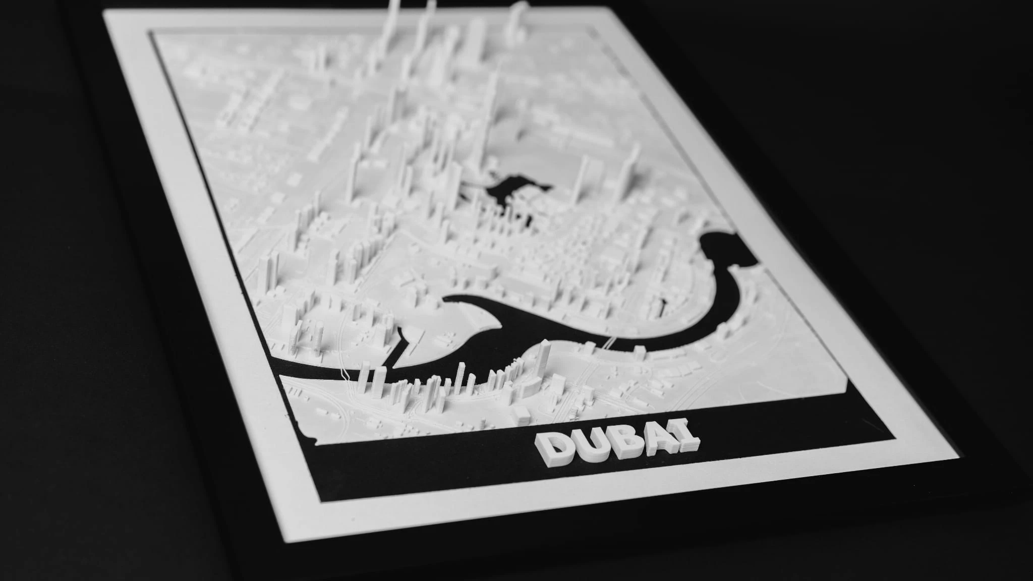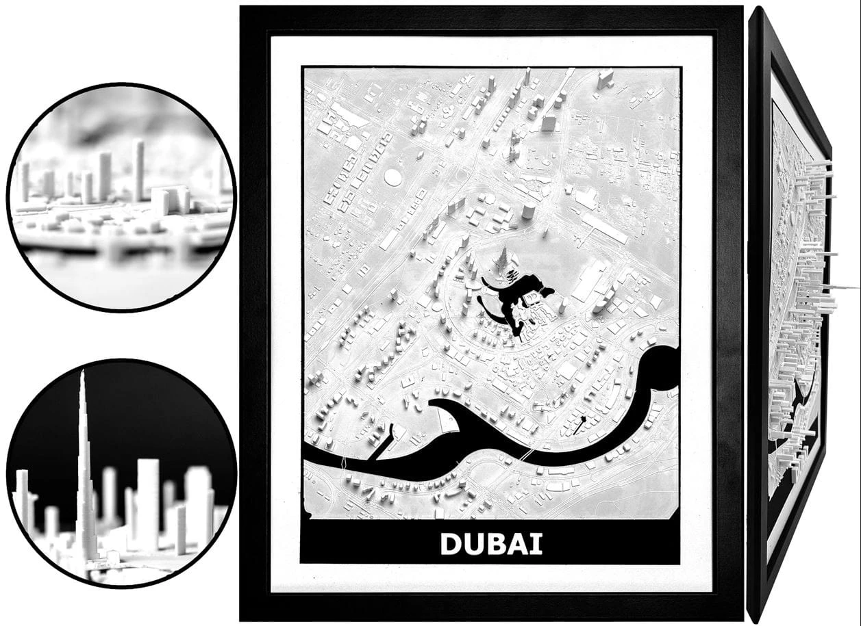 Obraz prezentuje trójwymiarowy plan Dubaju w czarnej, drewnianej ramie.