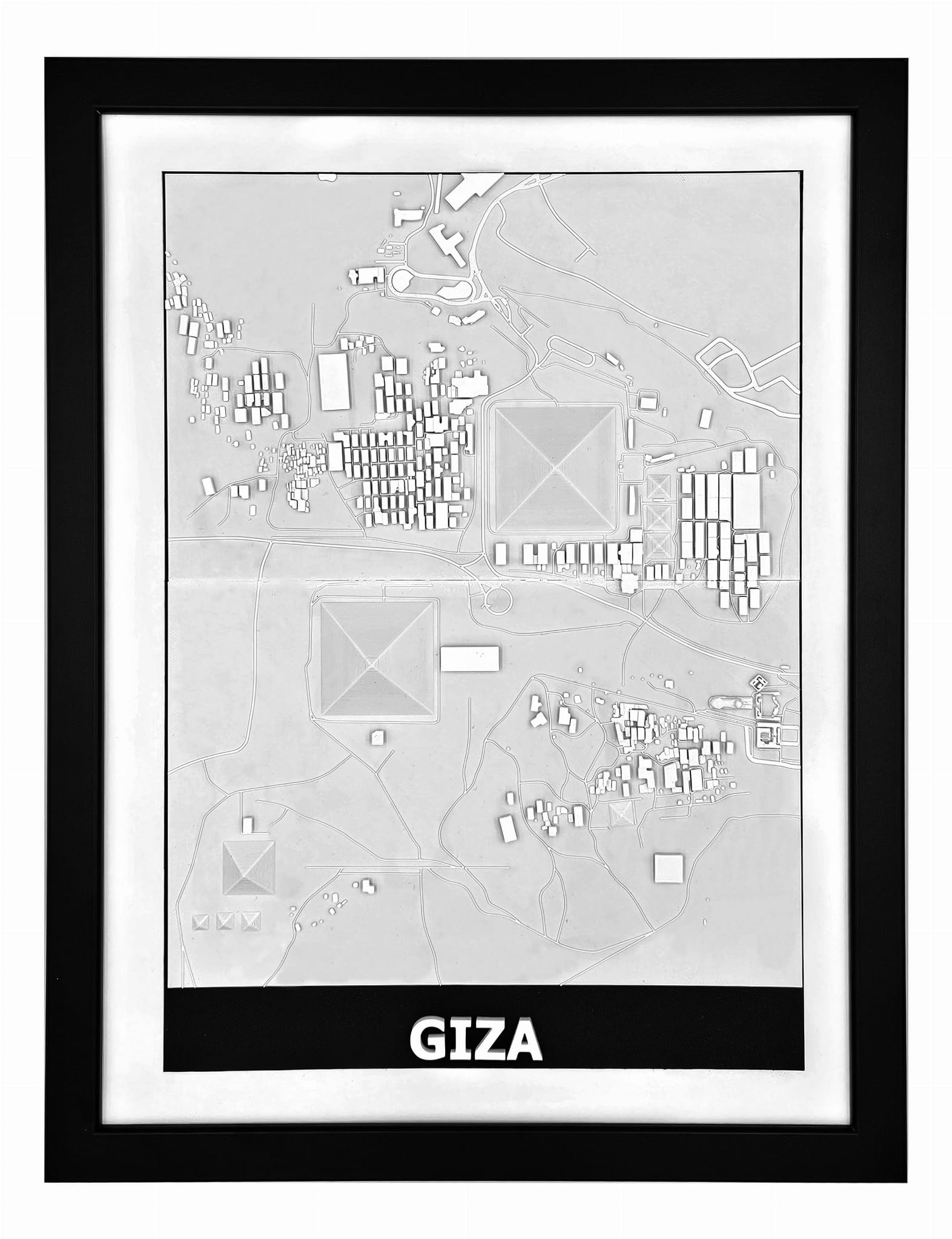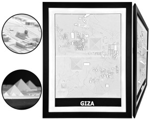 Obraz prezentuje trójwymiarowy plan piramid w Egipcie w czarnej, drewnianej ramie.