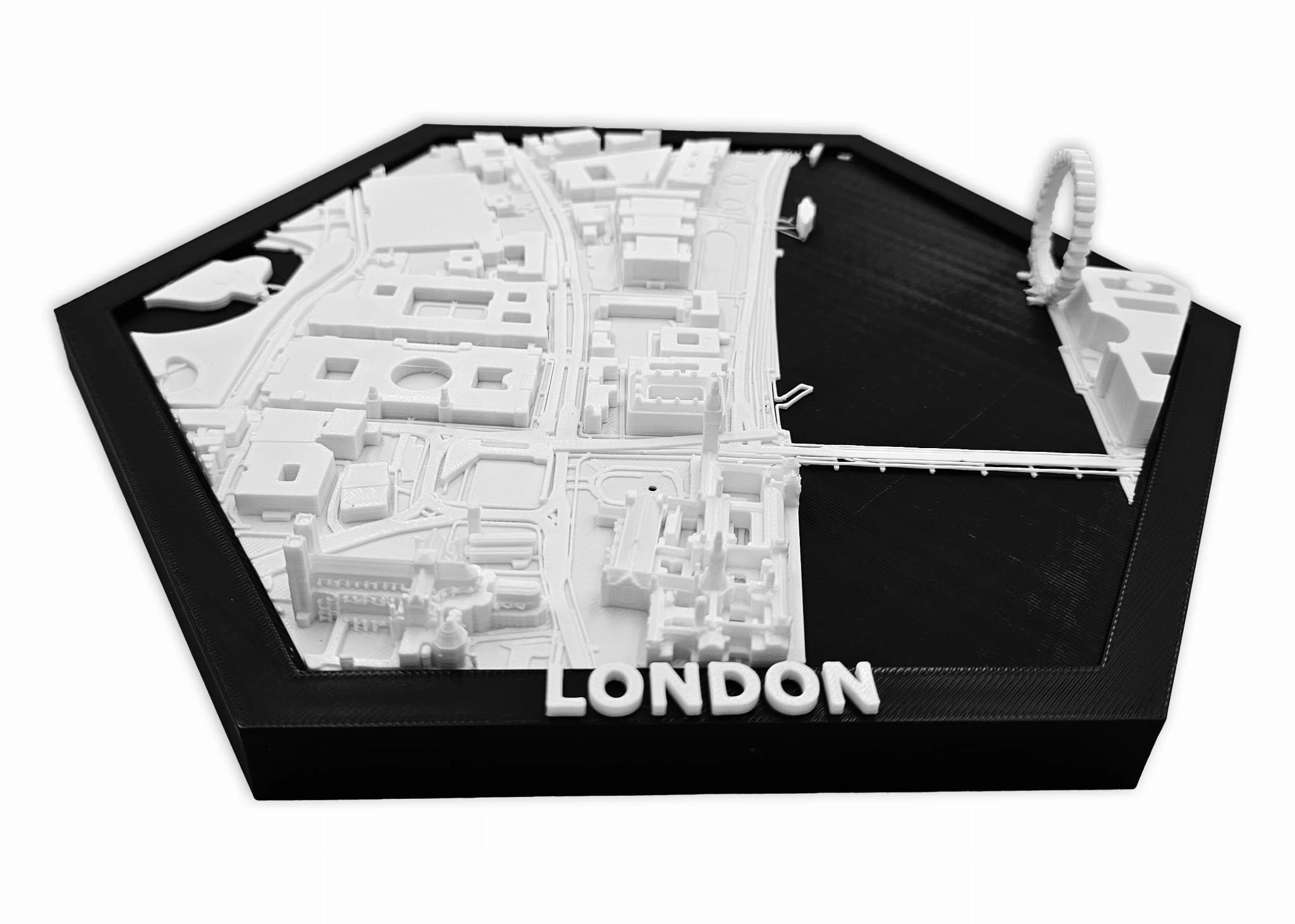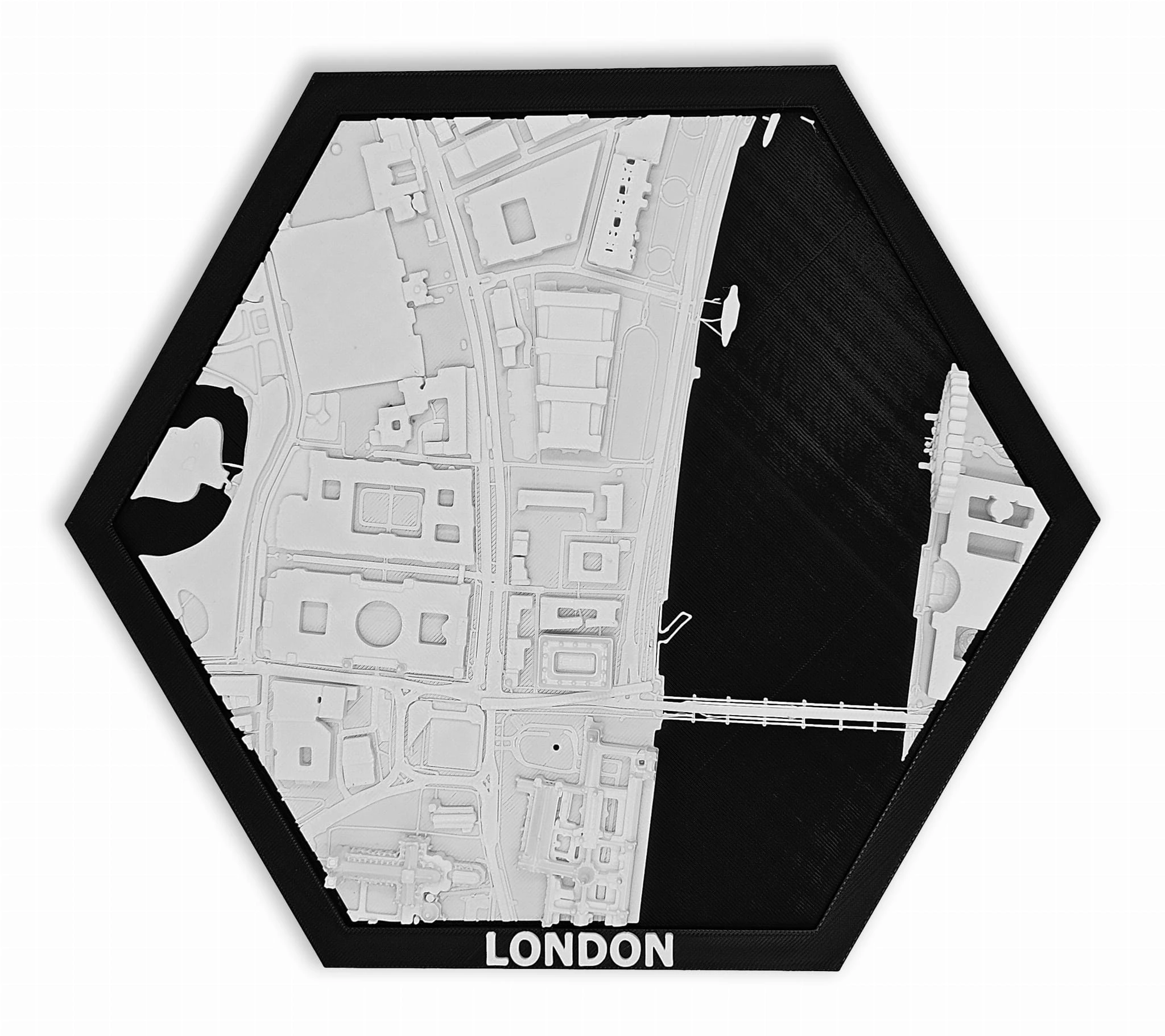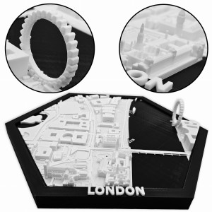 Obraz prezentuje trójwymiarowy plan Londynu w czarnej ramie z możliwością powieszenia.