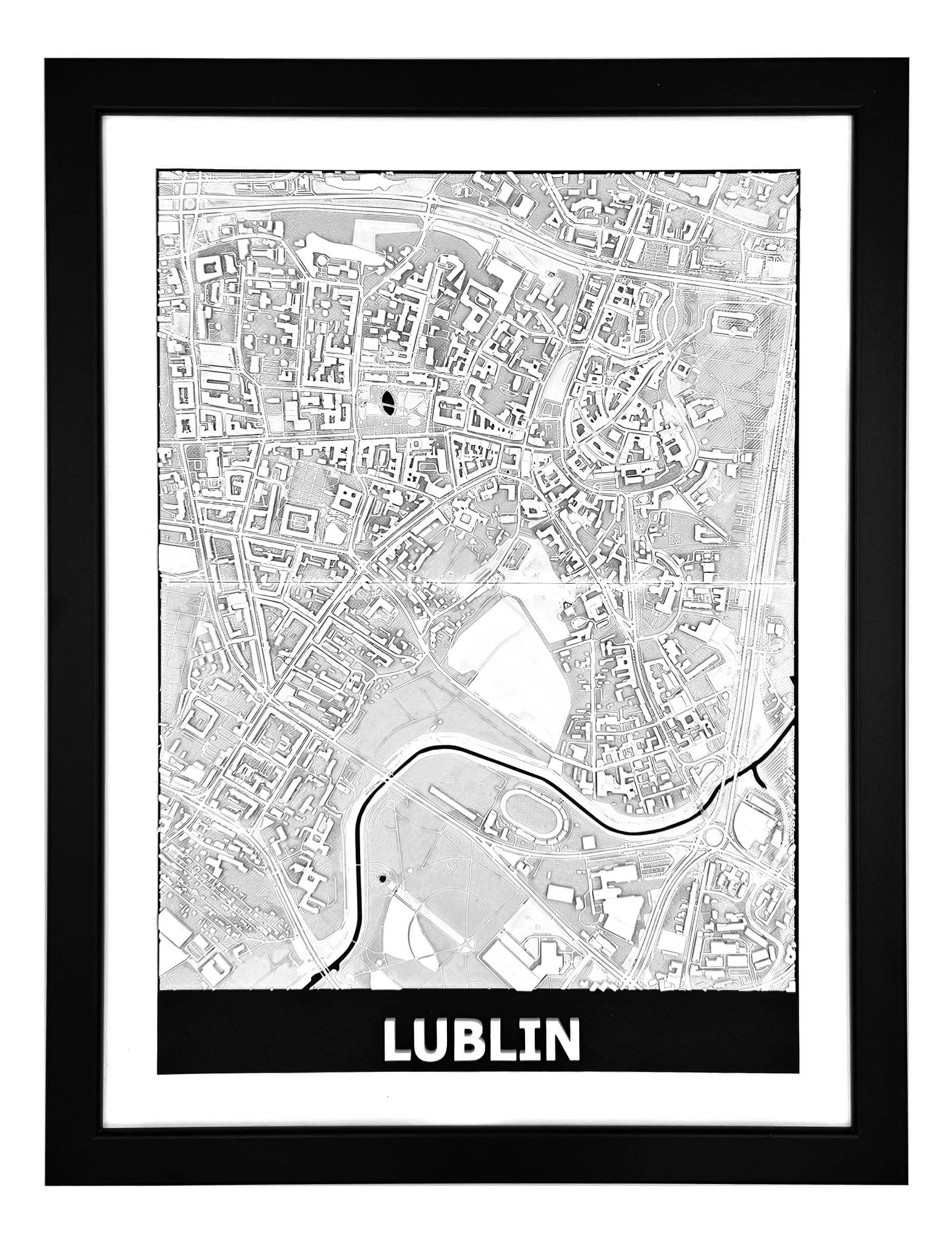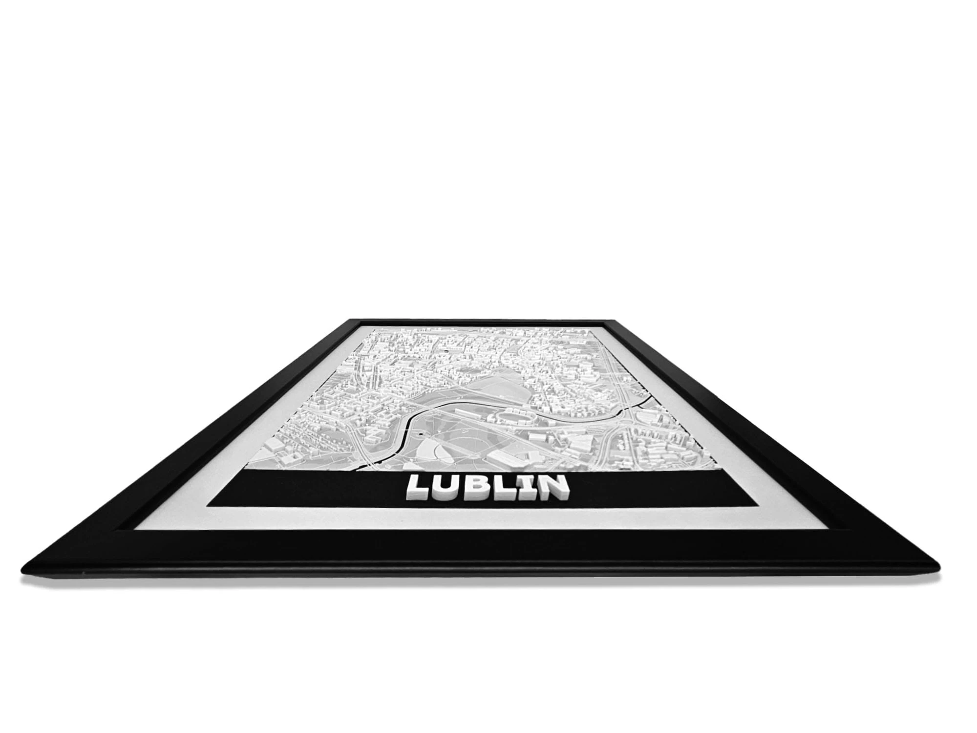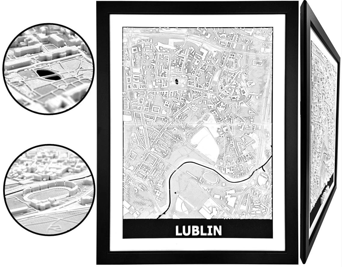 Obraz prezentuje trójwymiarowy plan Lublina w czarnej, drewnianej ramie.
