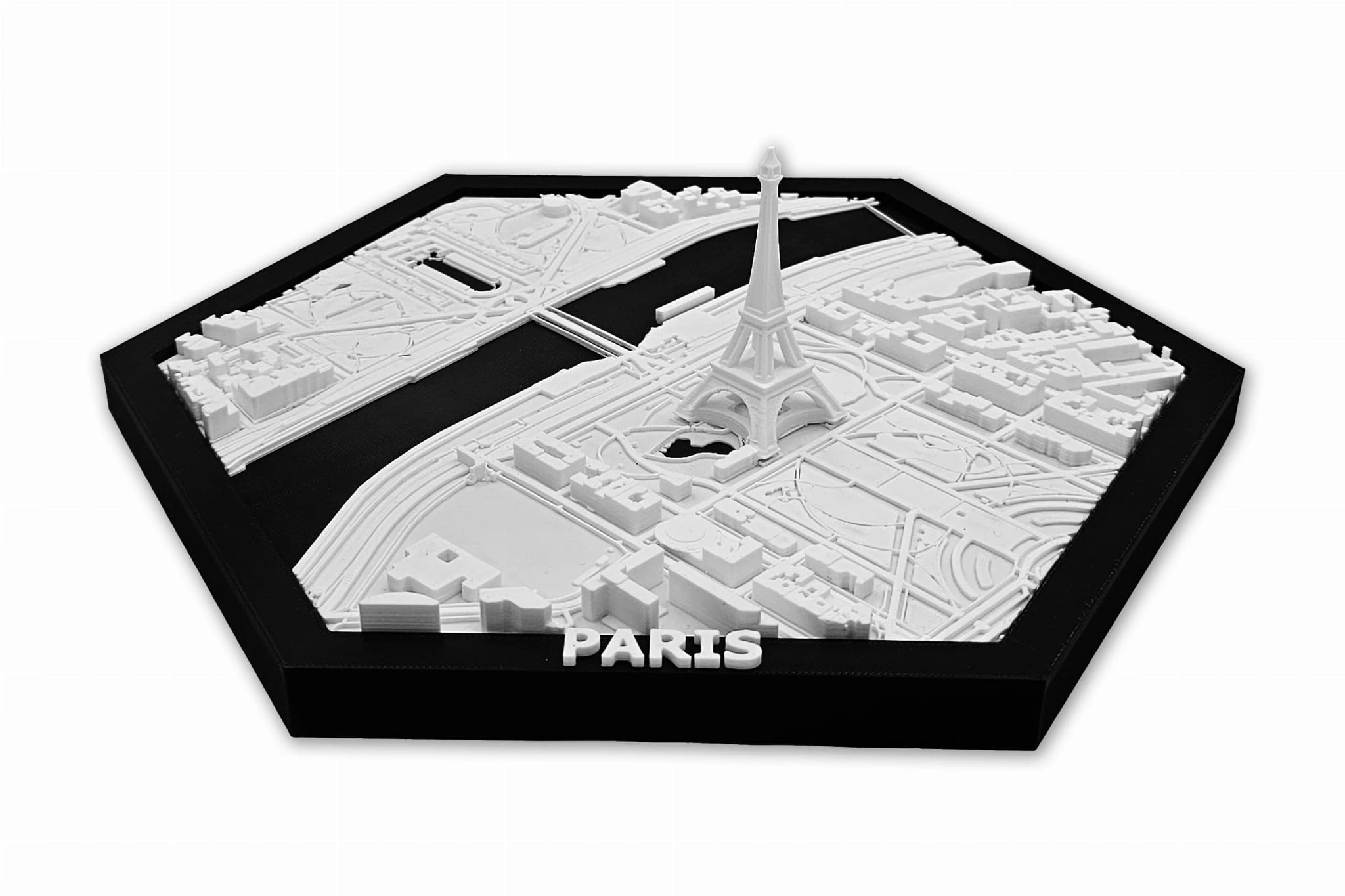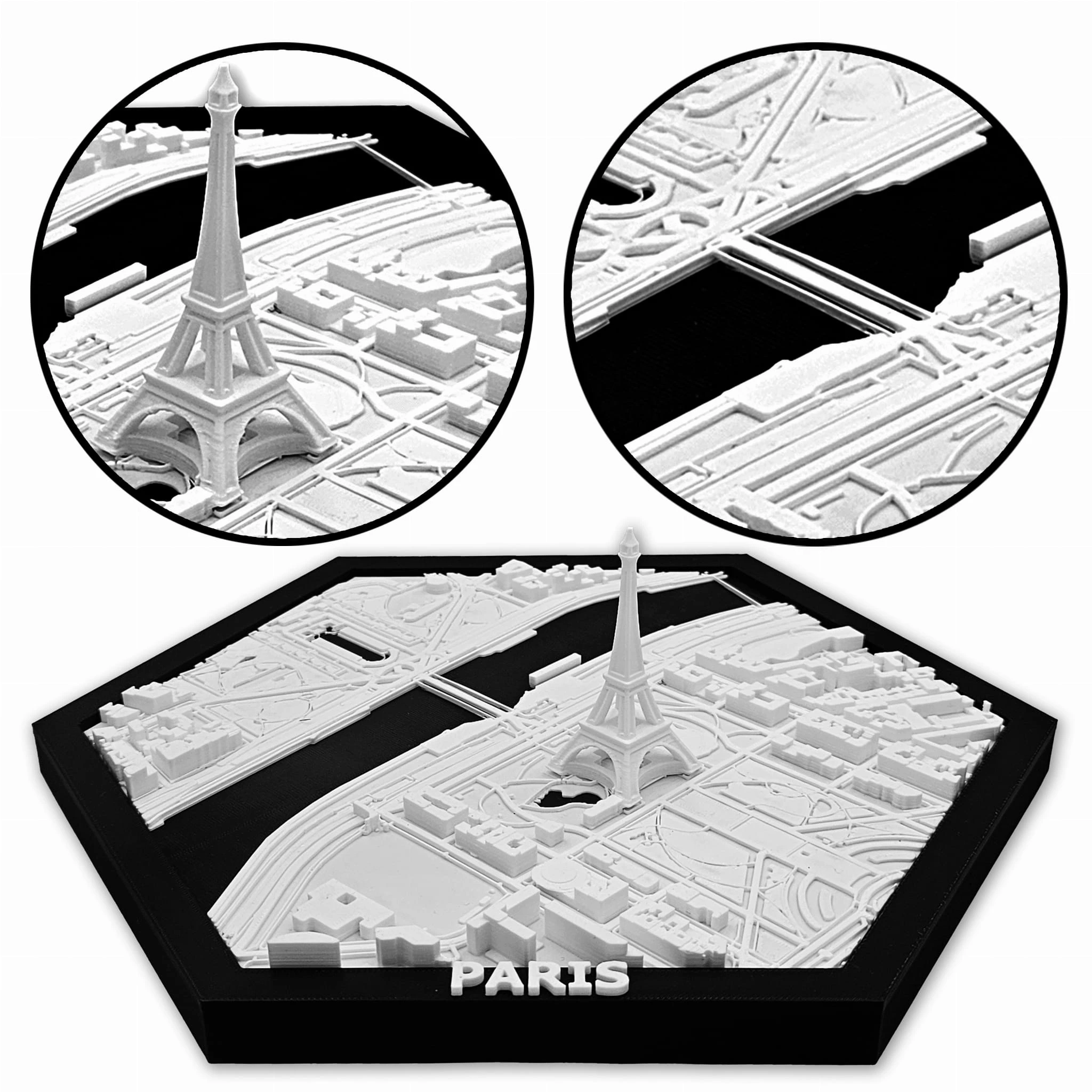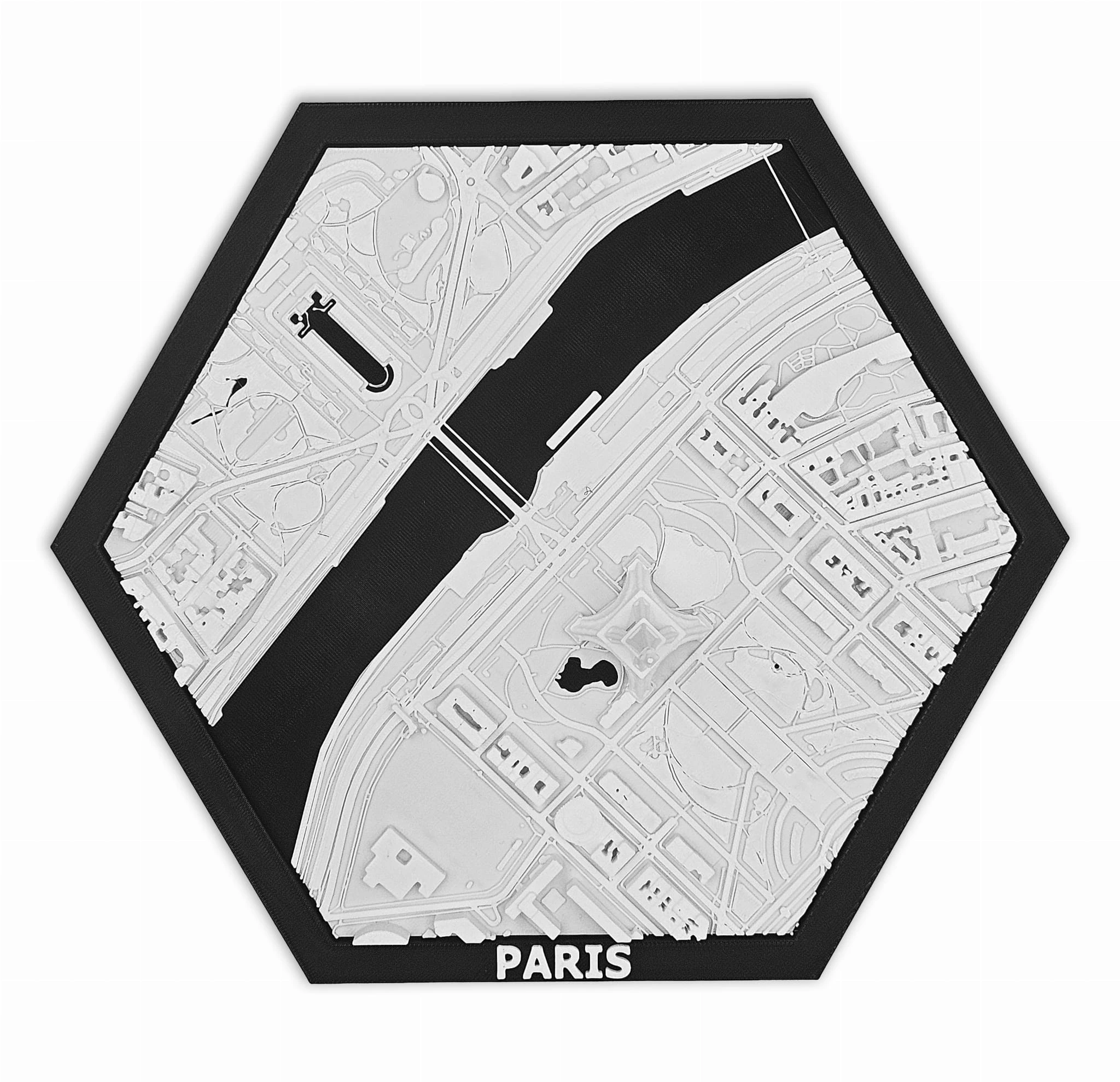 Obraz prezentuje trójwymiarowy plan Paryża w czarnej ramie z możliwością powieszenia.