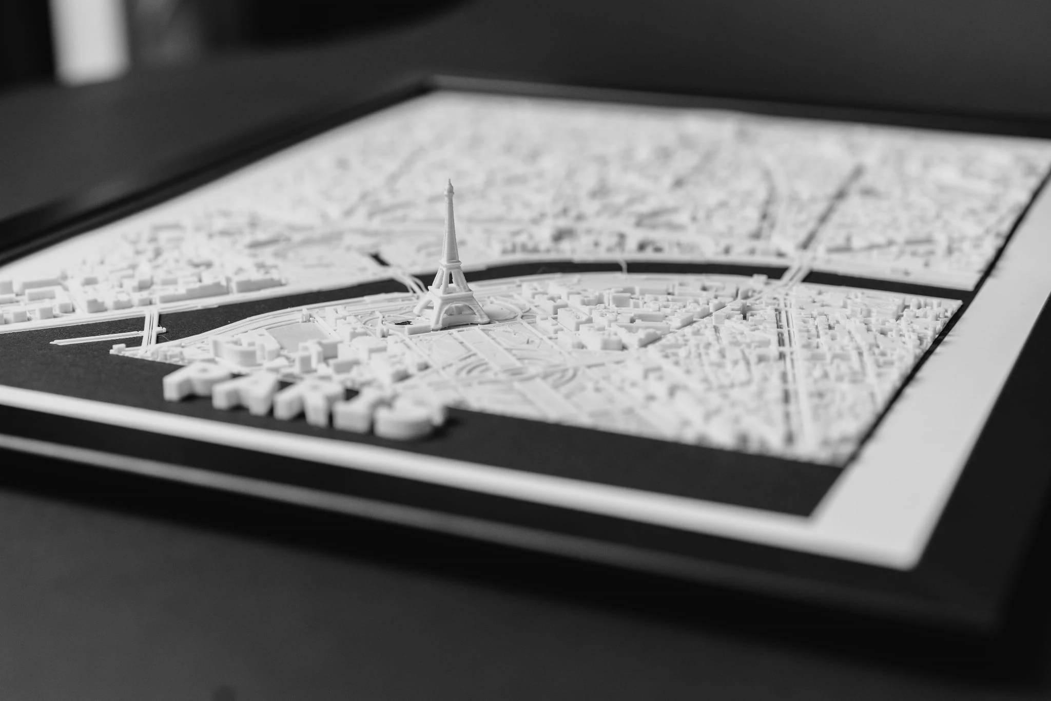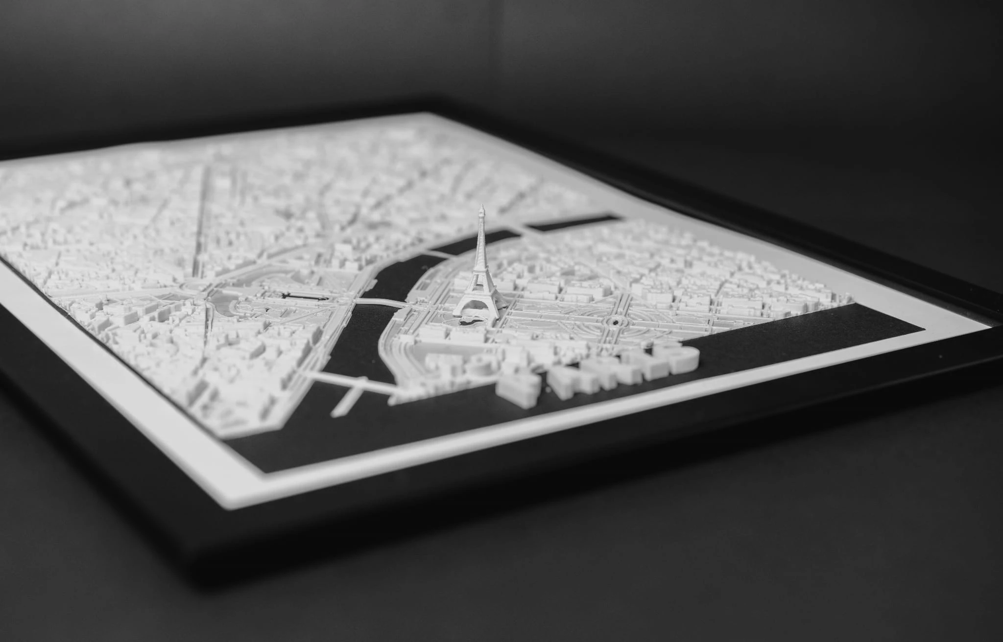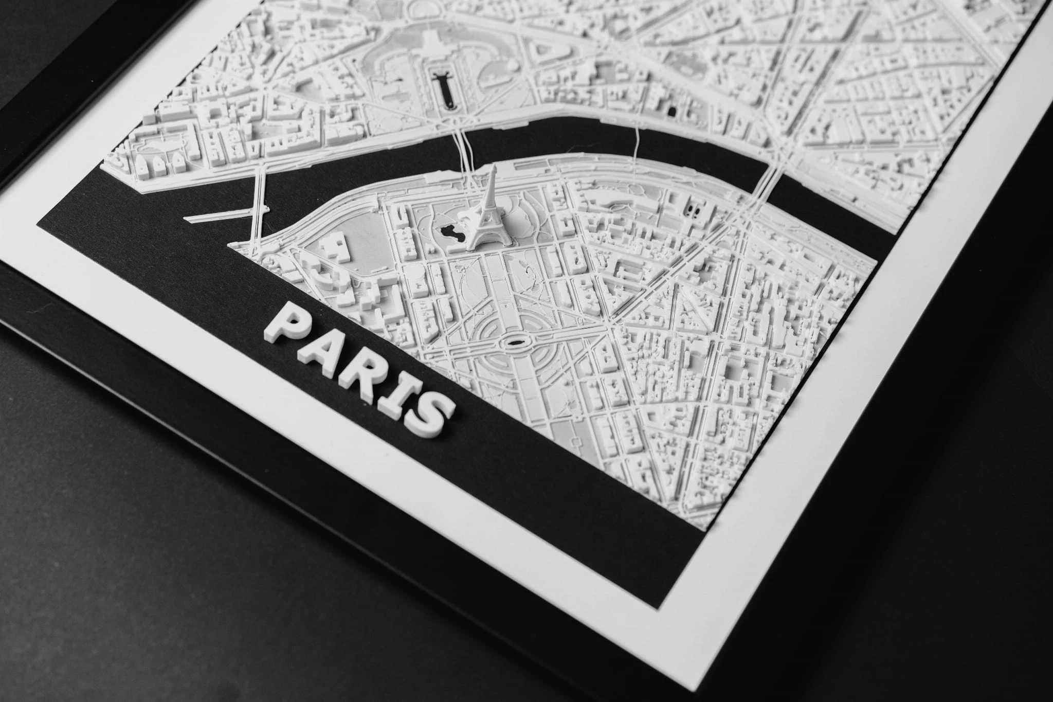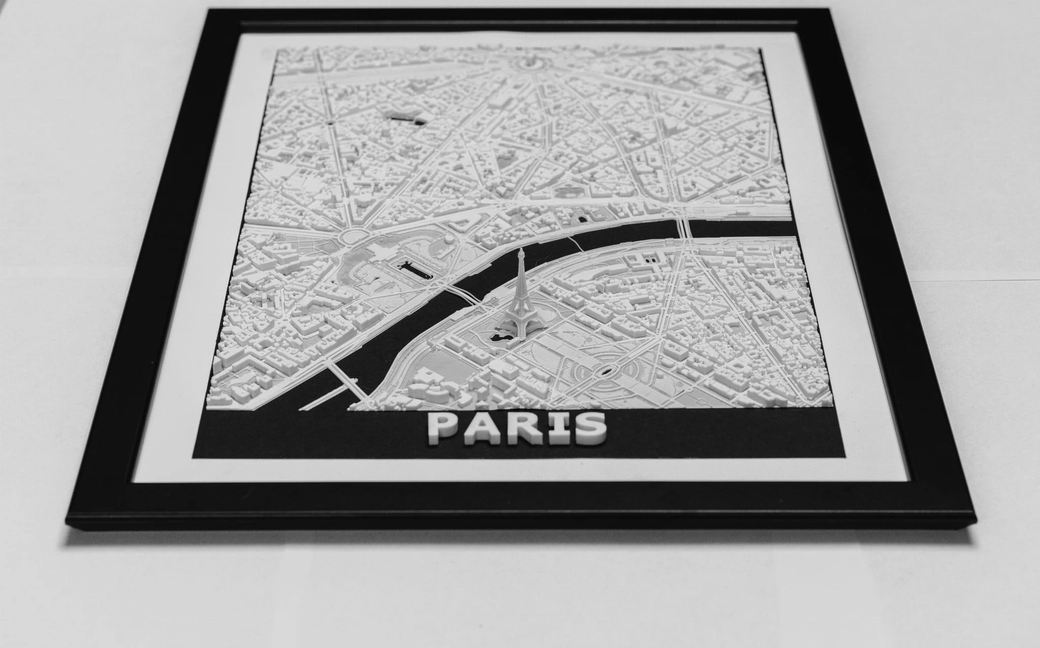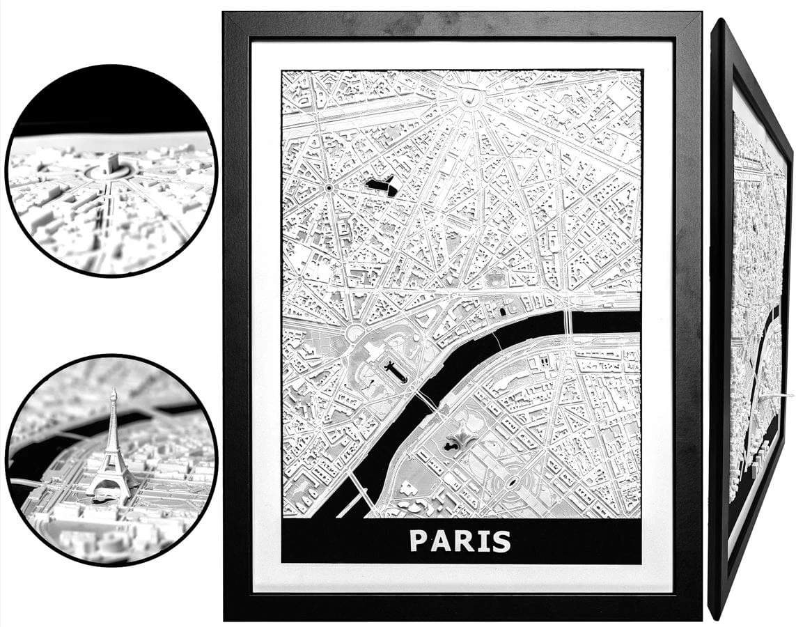 Obraz prezentuje trójwymiarowy plan Paryża w czarnej, drewnianej ramie.