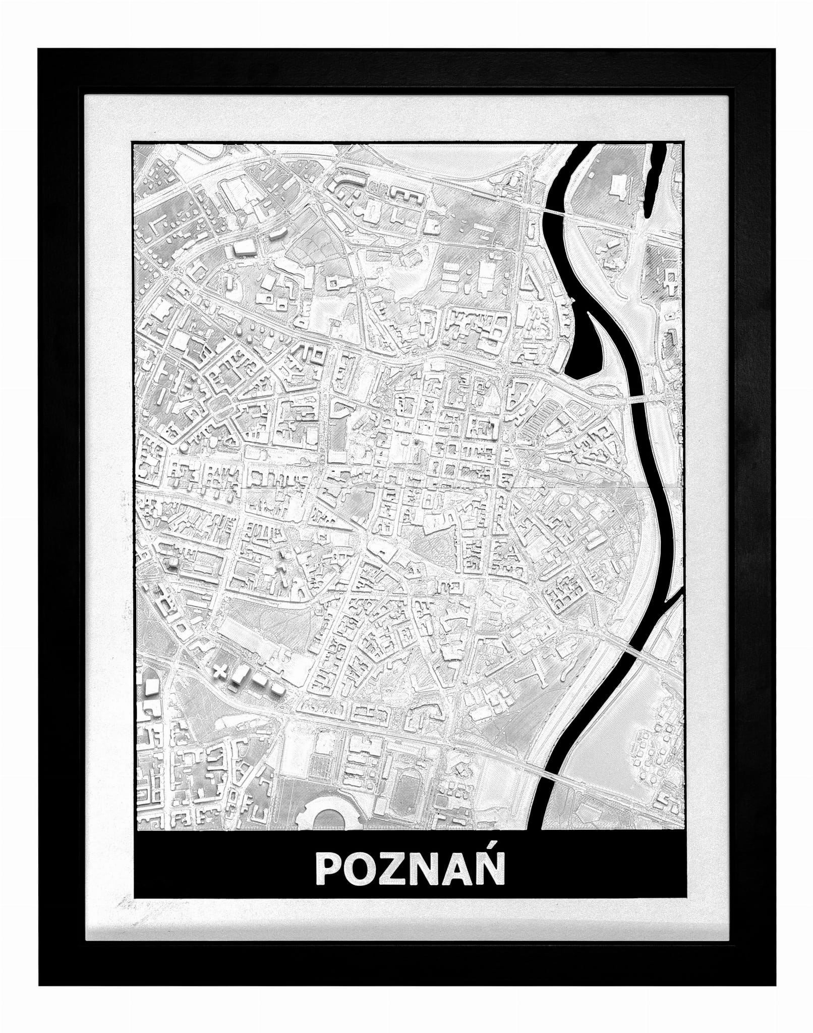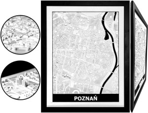 Obraz prezentuje trójwymiarowy plan Poznania w czarnej, drewnianej ramie.