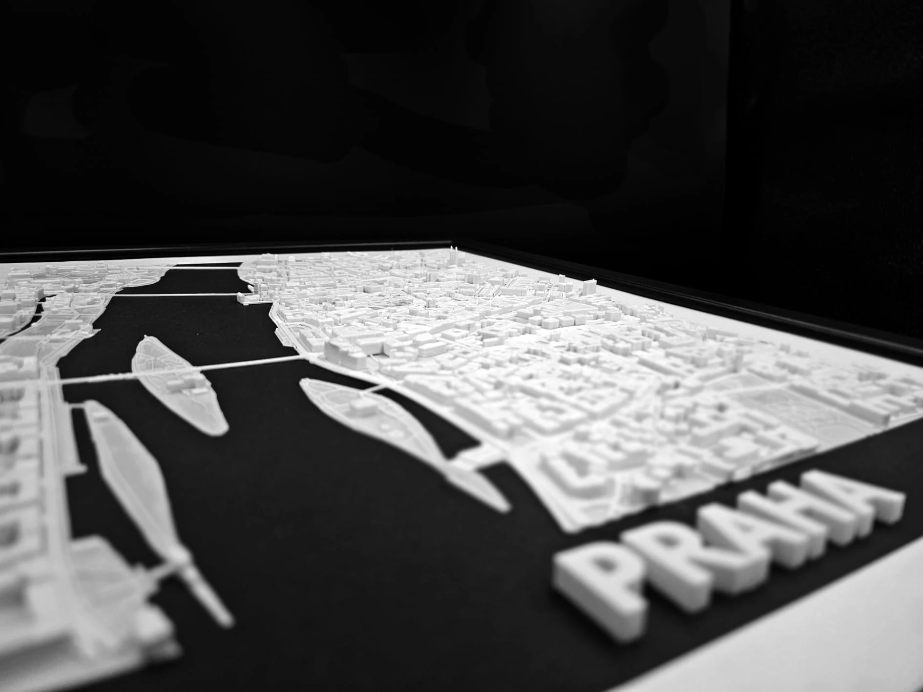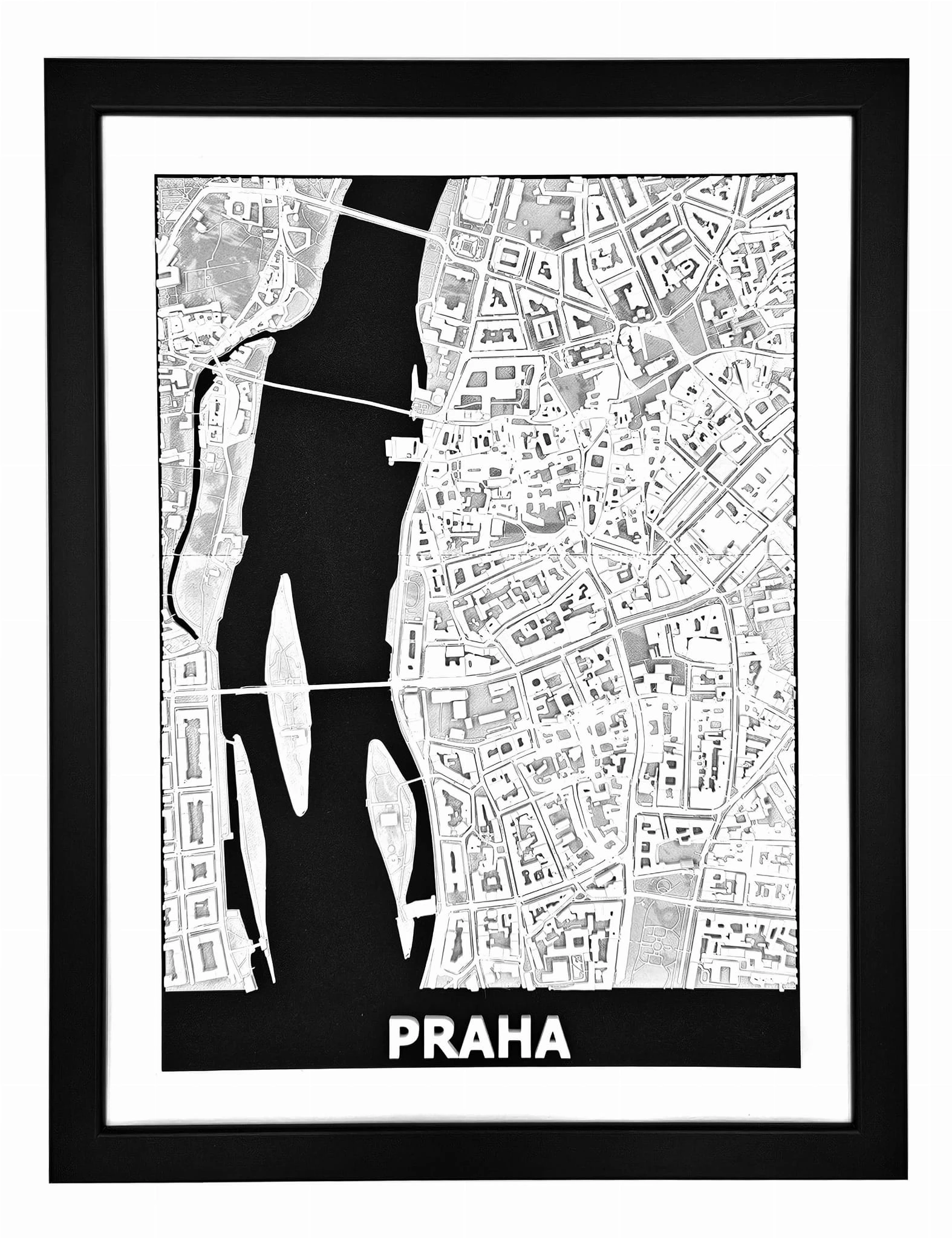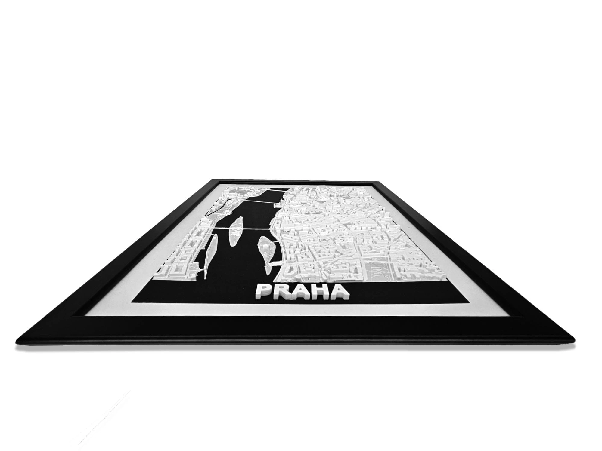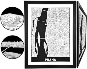 Obraz prezentuje trójwymiarowy plan Pragi w czarnej, drewnianej ramie.