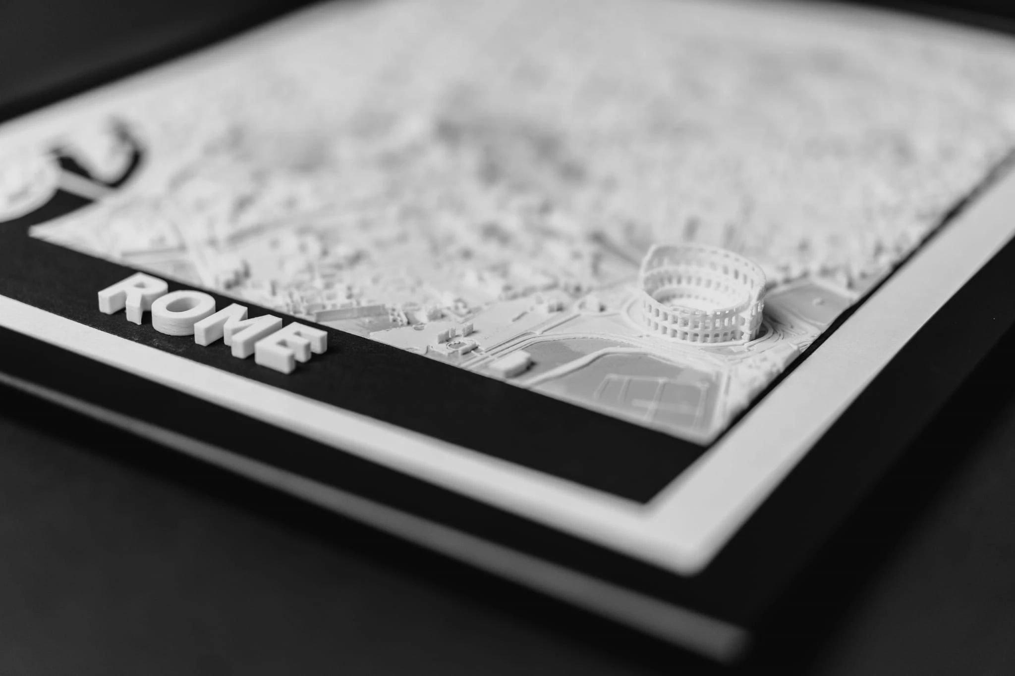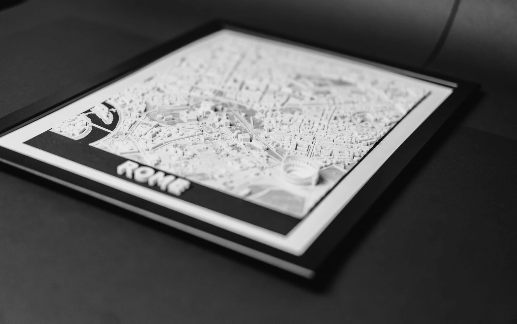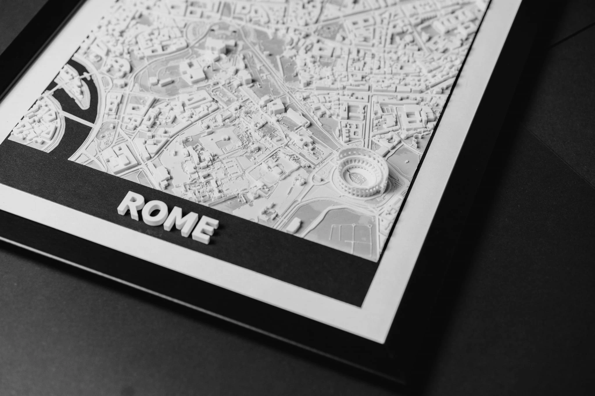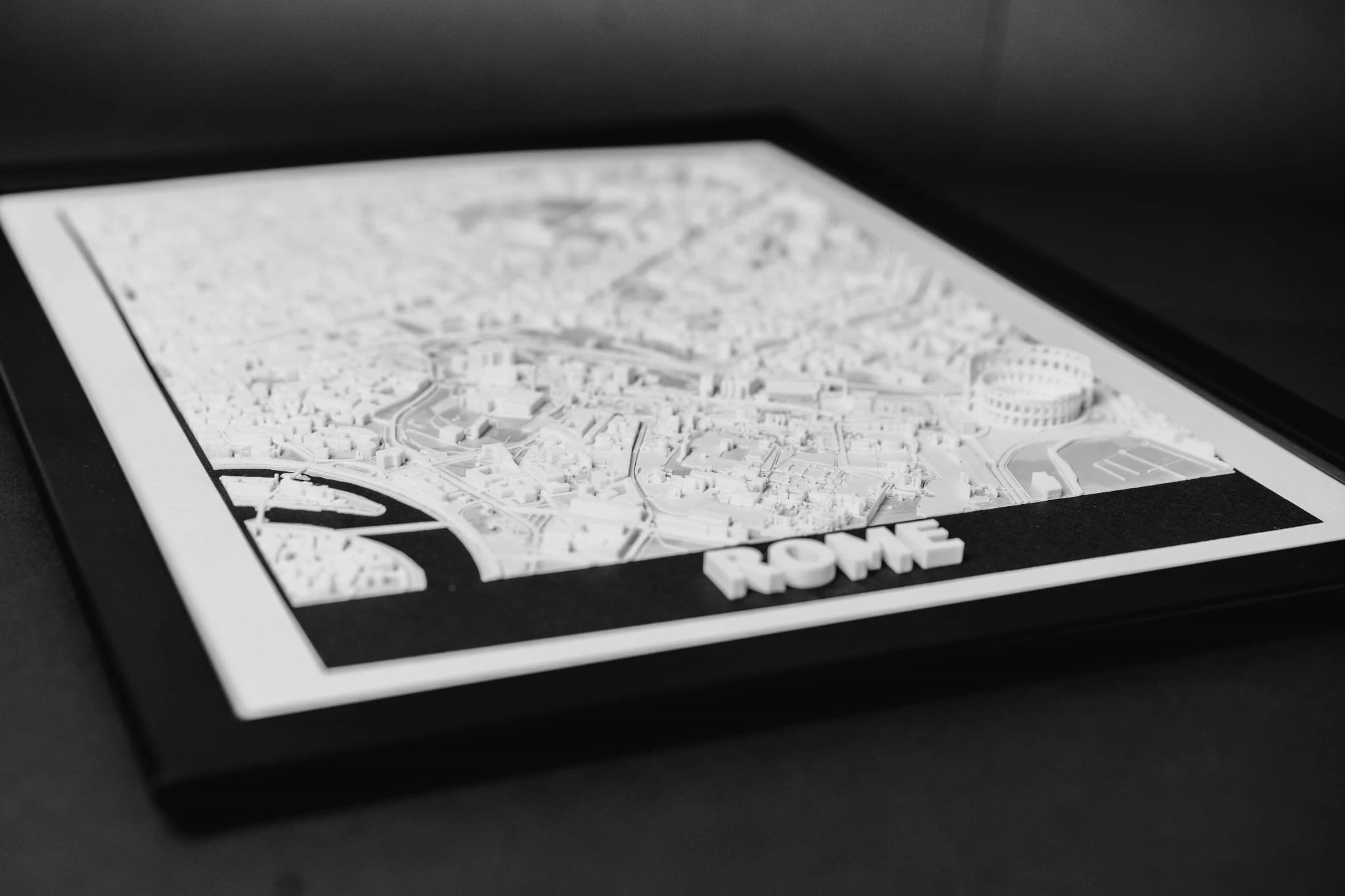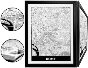 Obraz prezentuje trójwymiarowy plan Rzymu w czarnej, drewnianej ramie.