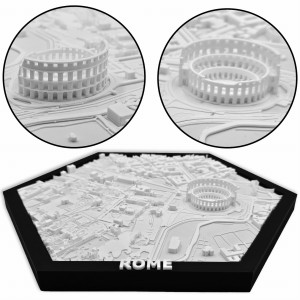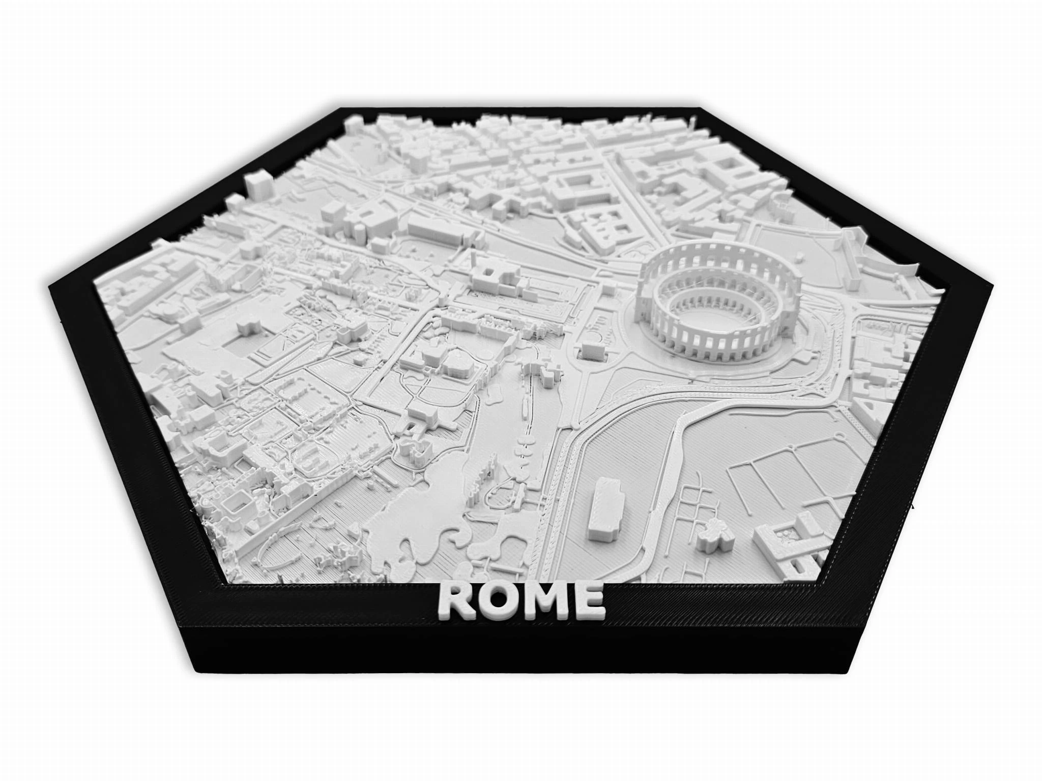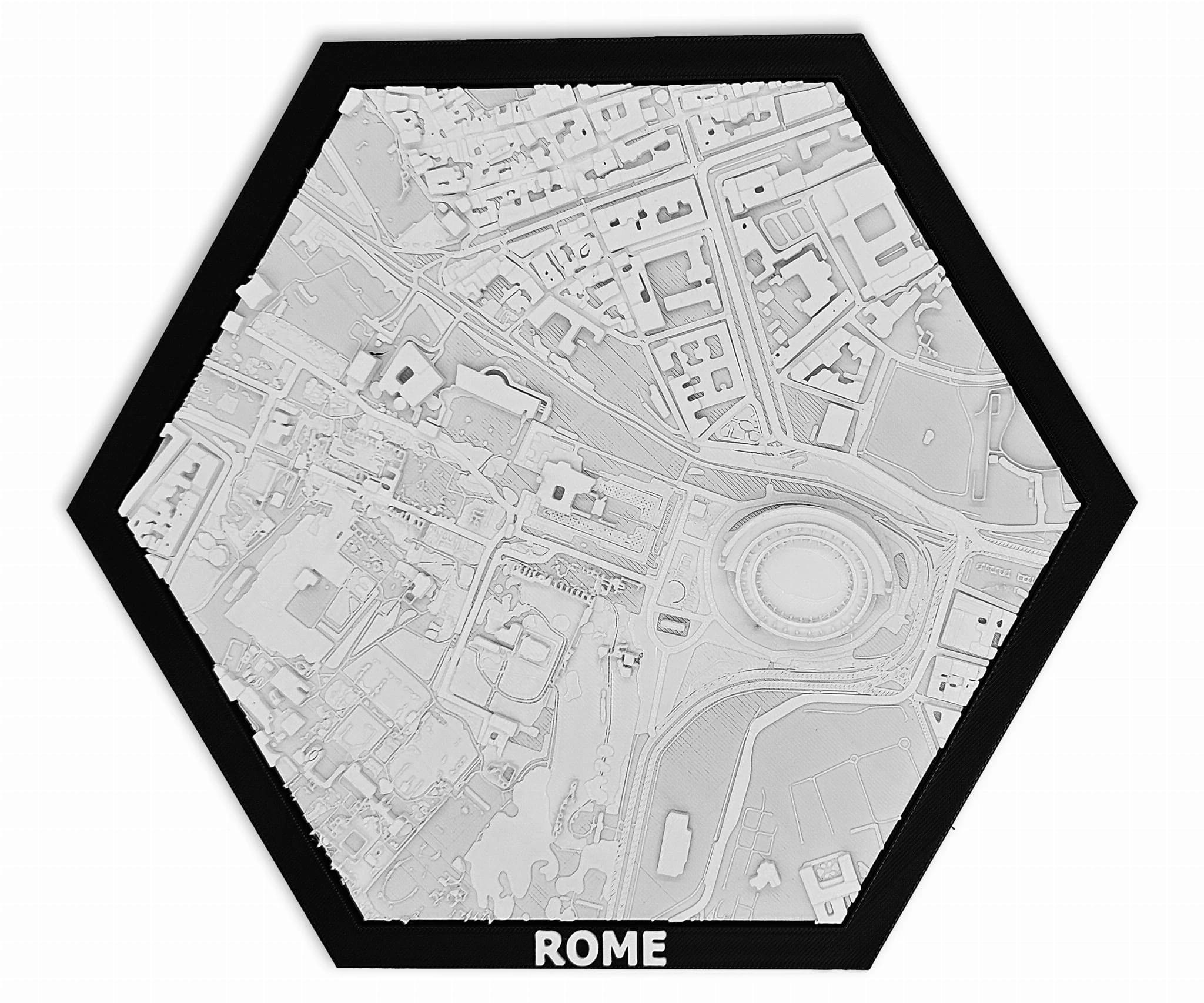 Obraz prezentuje trójwymiarowy plan Rzymu w czarnej ramie z możliwością powieszenia.